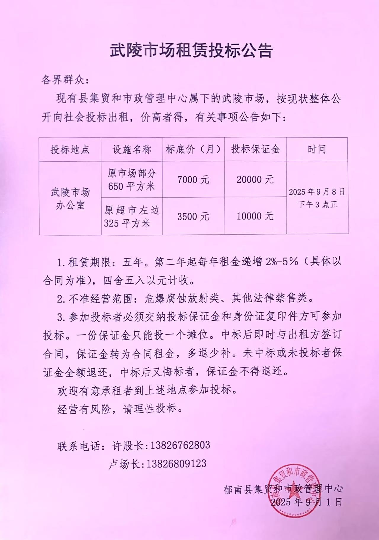 現有縣集貿和市政管理中心屬下的武陵市場,按現狀整體公開向社會投標出租,價高者得,有關事項公告如下: