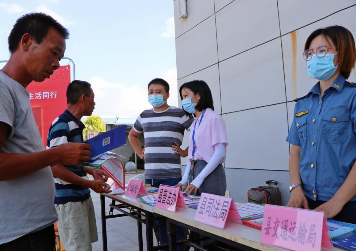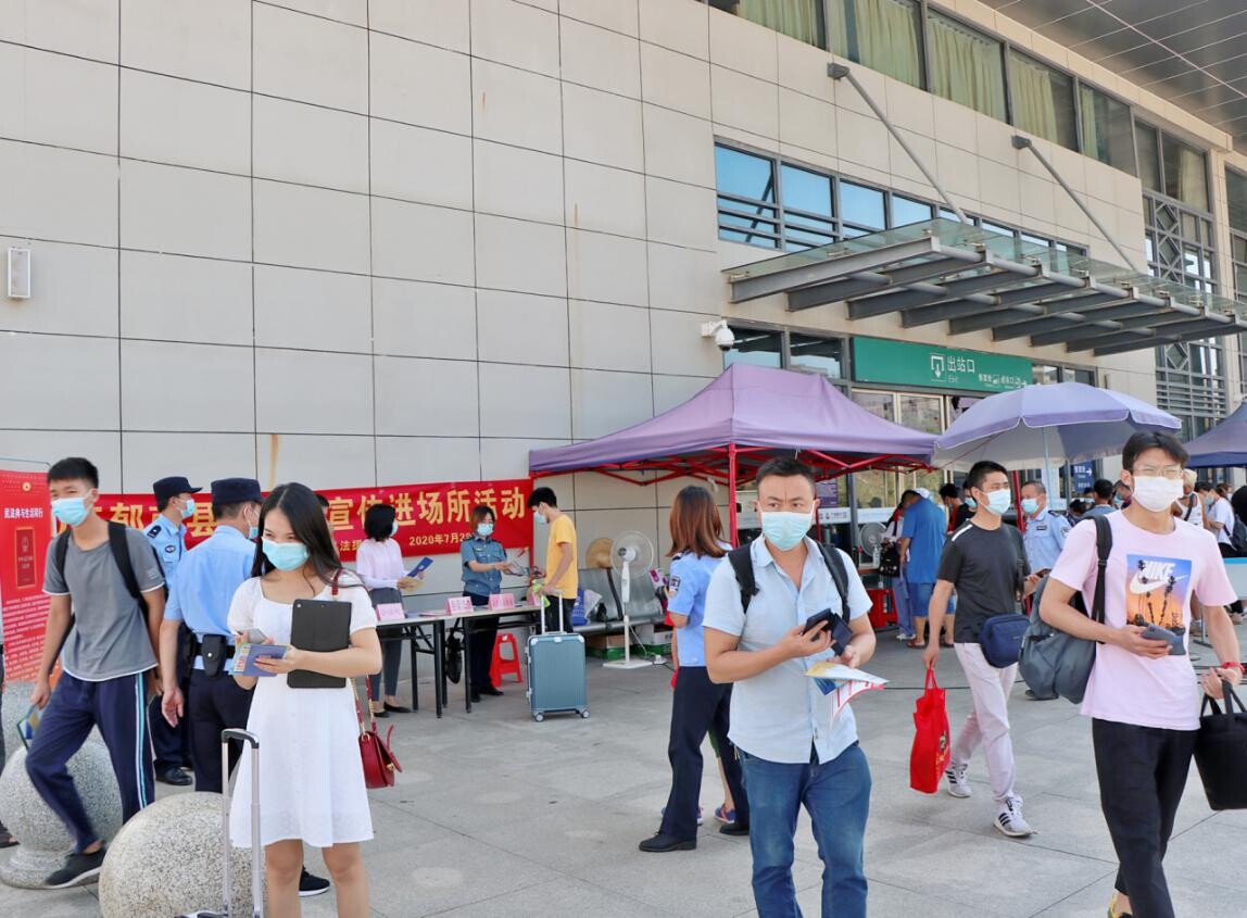 工作人員向出站的乘客派發(fā)《民法典》宣傳資料