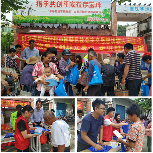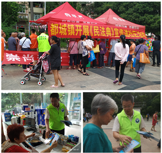 9月25日,都城、寶珠司法所聯合鎮禁毒辦、綜治中心等部門到社區、圩鎮設卡擺攤宣傳《民法典》。活動中,工作人員向群眾派發《民法典50問》宣傳手冊、《社區矯正常識》、《青少年毒品預防宣傳教育》和普法環保袋等宣傳資料,并手把手為群眾解惑釋疑。