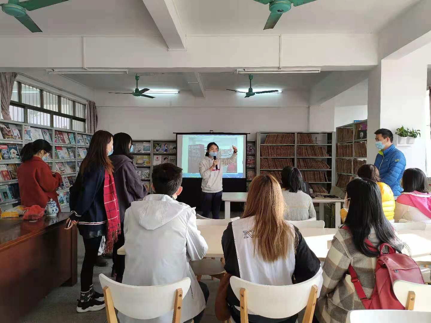 郁南縣圖書館館長朱曉樺向滿天星公益機構月捐人介紹圖書館少兒室的運營情況。