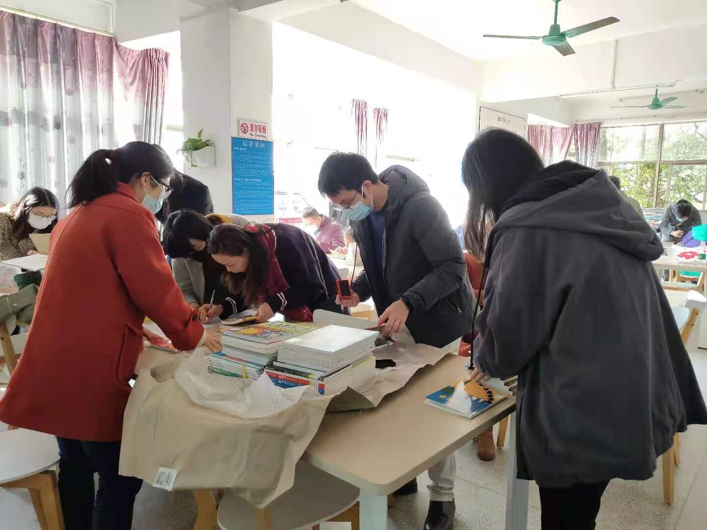 滿天星公益機構月捐人對少兒室近日收到的升級書籍500冊進行驗收以及上架。