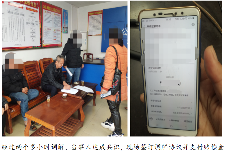 調(diào)解現(xiàn)場(chǎng),雖然工作人員結(jié)合前期調(diào)查的情況,提出了初步的賠償方案,但未能得到當(dāng)事人的認(rèn)同。在各方僵持不下之時(shí),工作人員改變思路,再次就此事件的經(jīng)過進(jìn)行分析,結(jié)合以往類似案例進(jìn)行講解,說明責(zé)任權(quán)重關(guān)系,讓各方當(dāng)事人認(rèn)清自己的應(yīng)負(fù)的責(zé)任。在近2個(gè)小時(shí)的調(diào)解后,當(dāng)事人之間最終達(dá)成共識(shí),并現(xiàn)場(chǎng)簽訂調(diào)解協(xié)議書,即時(shí)支付賠償金。