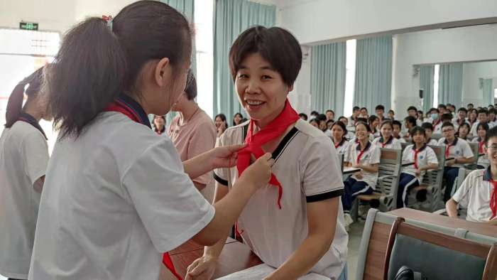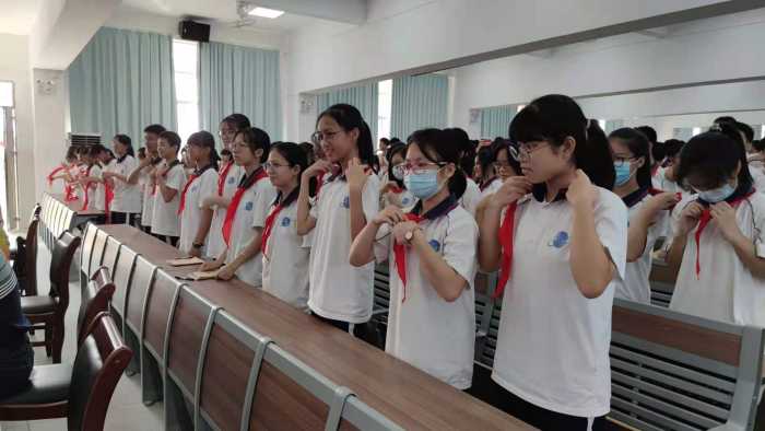 隊員們解下胸前的紅領巾,折疊好,在少先隊大隊輔導員孫明容老師的帶領下,少先隊員們正式向紅領巾告別,同時也告別少年時代,以青春活潑、積極向上的面貌迎接青年時代。