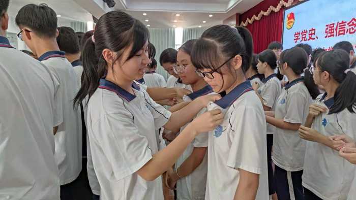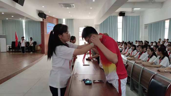 學校團委書記陳演年老師宣讀了新團員入團決定后,老團員為新團員佩戴團徽。