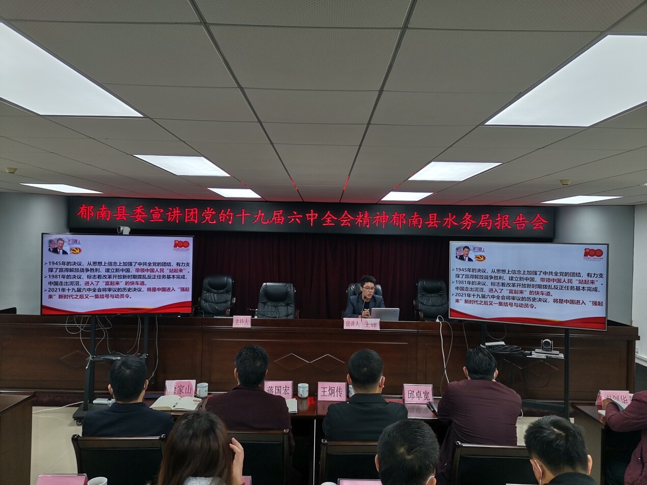 為全面深入學習領會黨的十九屆六中全會精神,扎實推進全系統學習宣傳貫徹工作,融合推動黨史學習教育走深走實,12月19日,縣水務局邀請縣委宣講團成員、西江中學教師王鋒同志作黨的十九屆六中全會專題輔導報告會。局領導班子全體成員、下屬單位負責人和全體黨員干部職工參加了會議。