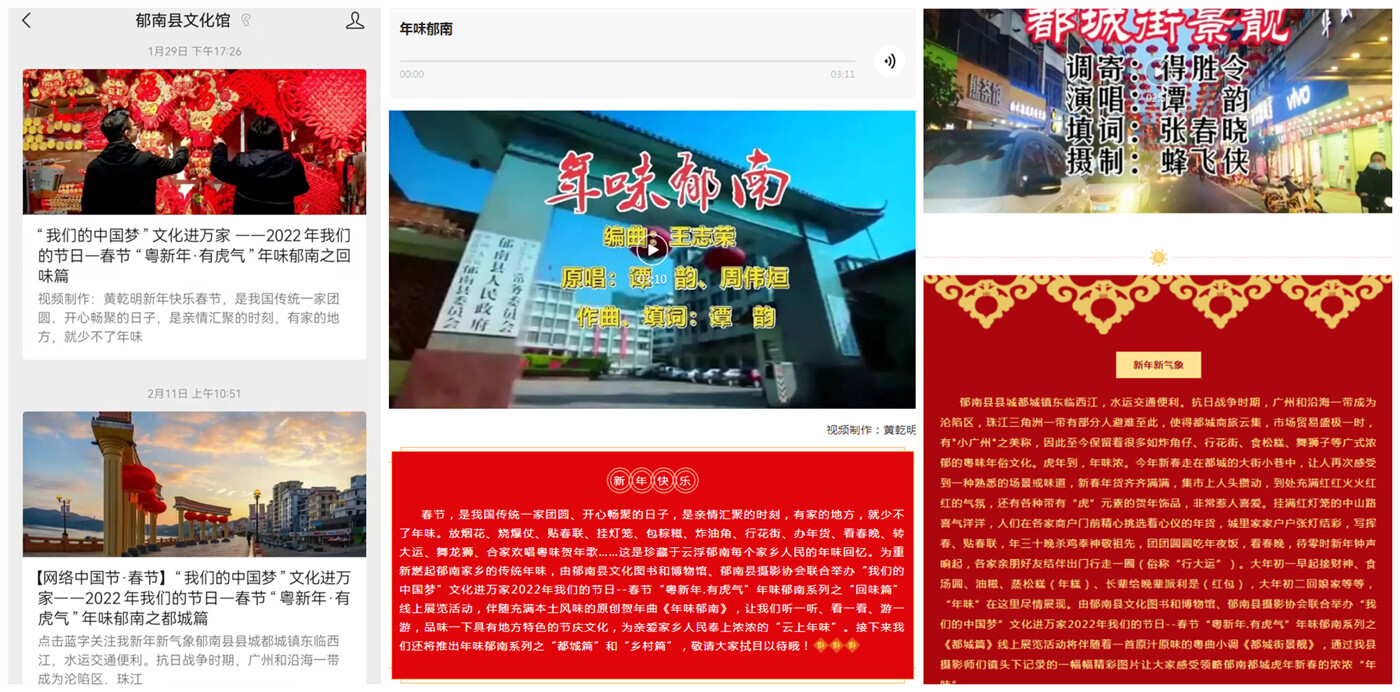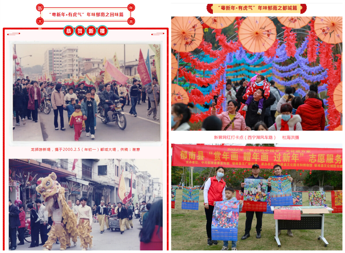 為滿足疫情防控期間廣大群眾對文化生活的需求,郁南縣文化圖書和博物館在春節期間積極推進線上文化活動,把濃濃“年味”送給千家萬戶。其中之一,是由郁南縣文化圖書和博物館、郁南縣攝影協會聯合舉辦的“我們的中國夢”文化進萬家2022年我們的節日--春節“粵新年.有虎氣”年味郁南系列之《回味篇》和《都城篇》線上展覽活動。該活動通過郁南縣文化館微信公眾號推出,上線以來受到各界群眾的廣泛關注和點贊,閱讀量累計近1800人次。