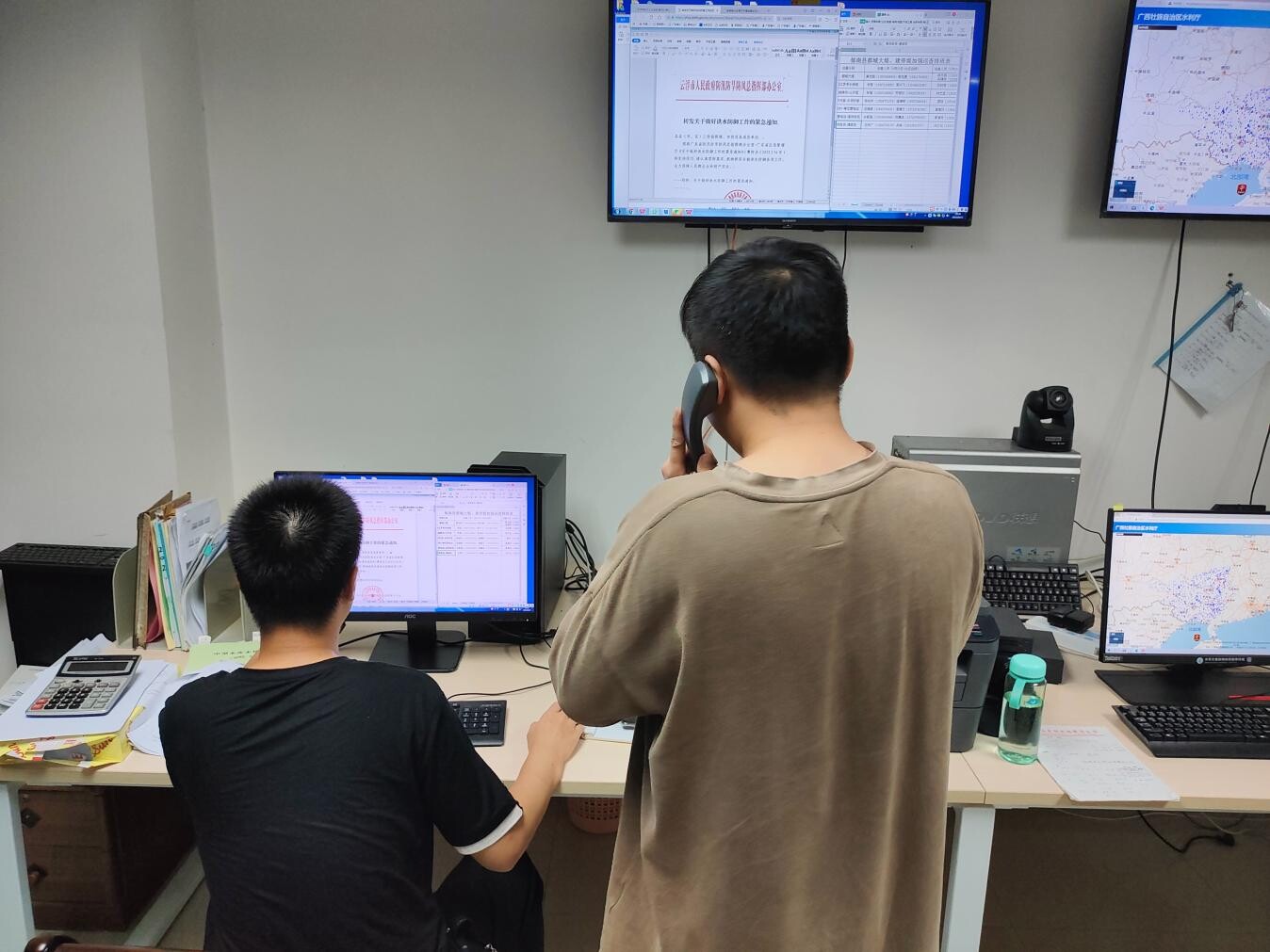 “6月20日3時西江都城站水位為17.67米...”“建城堤高鐵橋墩上游200米位置滲漏點,請現場技術人員反饋現在監測情況...”“羅旁水閘閘門已打開,請向陽水庫開展水位調控工作...”縣水務局總值班室值守人員正有條不紊、快而有序地報送郁南縣河道、水庫實時水位、受災情況及臺賬式調度水庫、沿江各鎮水利工程隱患點監控。值班人員顧不上連日值守的疲憊,堅定地說:“重要時期可不能松懈,確保信息報送的時效性,確保隱患點險情動態可控”。