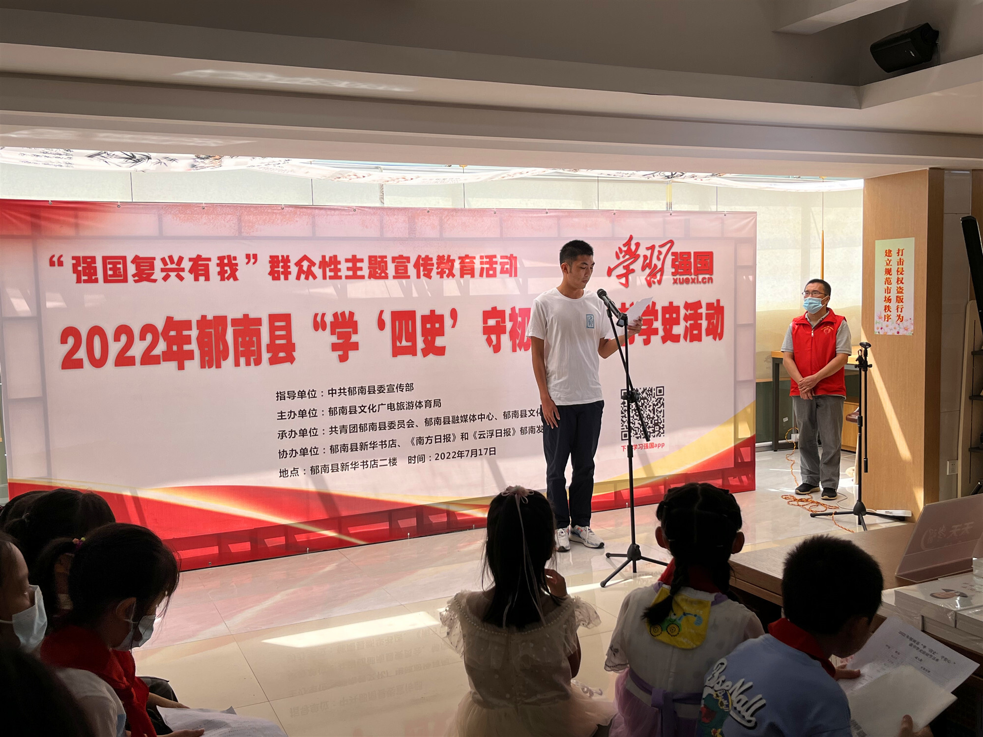 為進一步深入開展“四史”宣傳教育,推動郁南縣黨史學習教育常態長效化和全民讀書學史活動,涵育全民閱讀新風尚,培育和踐行社會主義核心價值觀,豐富廣東省文明城市創建內涵,7月17日,縣委宣傳部、縣文廣旅體局、團縣委和縣新華書店聯合舉辦2022年郁南縣“學‘四史’ 守初心 ”讀書學史活動。參與活動的還有共青團郁南縣委員會、郁南縣文化圖書和博物館、郁南縣新華書店有關干部職工及藍銘志愿服務協會志愿者們。該項活動受到廣大群眾歡迎。