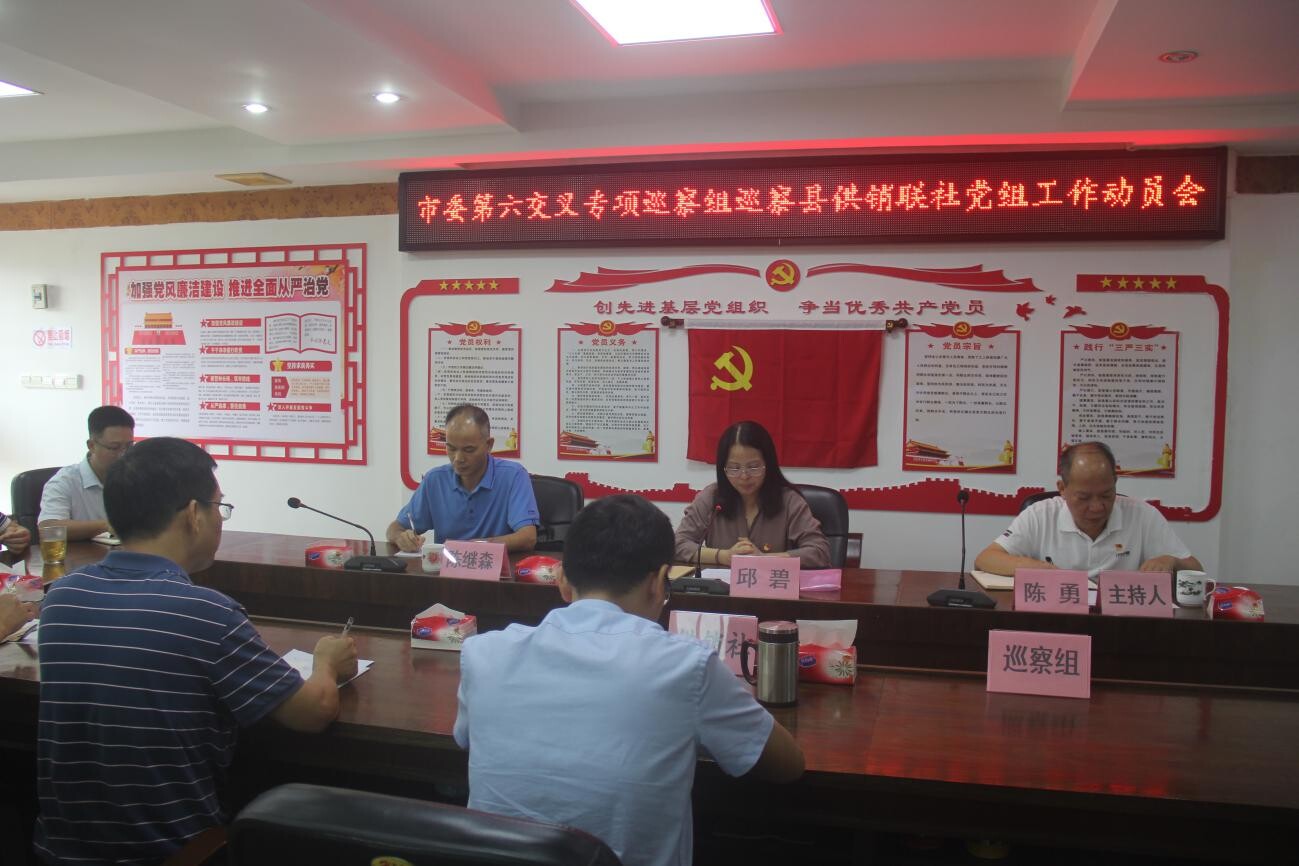 會上,市委第六交叉專項巡察組組長邱碧同志作了動員講話,深刻闡述了開展巡察工作的重要意義,詳細介紹了巡察工作的內容、方式及相關情況,并提出了明確要求。縣供銷合作聯社黨組書記陳勇作表態性發言,強調要高度重視,切實提高認識,服從專項巡察組的統一安排,積極做好溝通協調、提供材料、后勤保障等各項工作,為巡察組開展工作創造良好環境,確保巡察組在我社工作順利開展。