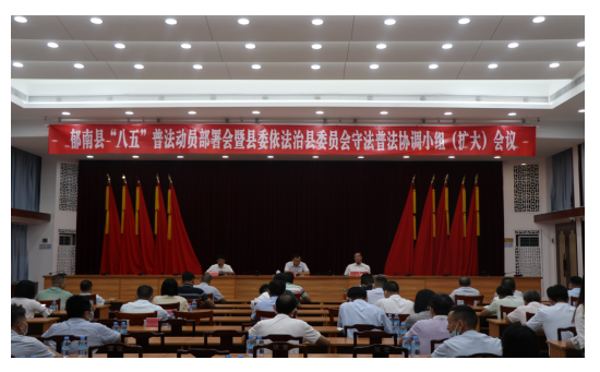 為深入學習貫徹黨的十九屆六中全會精神,貫徹落實習近平法治思想,以及中央全面依法治國、省委全面依法治省、市委全面依法治市工作會議精神,9月20日上午,郁南縣召開“八五”普法動員部署會暨縣委全面依法治縣委員會守法普法協調小組(擴大)會議。縣政府副縣長、縣公安局局長王朝輝出席會議并講話。縣委全面依法治縣辦副主任、守法普法協調小組副組長、縣司法局局長賴偉強主持會議。縣委全面依法治縣委員會守法普法協調小組成員單位有關負責人;各鎮,縣直和上級駐郁南單位分管負責同志參加會議。
