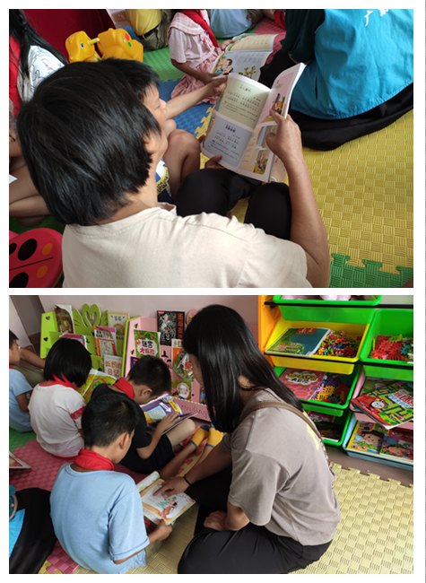 小朋友們在書架上選取了自己感興趣的繪本,通過分享董存瑞、狼牙山五壯士、劉胡蘭等革命先輩的紅色故事,相互交流讀書經(jīng)驗(yàn)。志愿者們還指導(dǎo)家長們?nèi)绾沃v述繪本、吸引孩子們的注意力;同時(shí)鼓勵(lì)孩子們模仿故事情節(jié)的,做出故事內(nèi)容的表情和動(dòng)作,激發(fā)孩子的想象力。