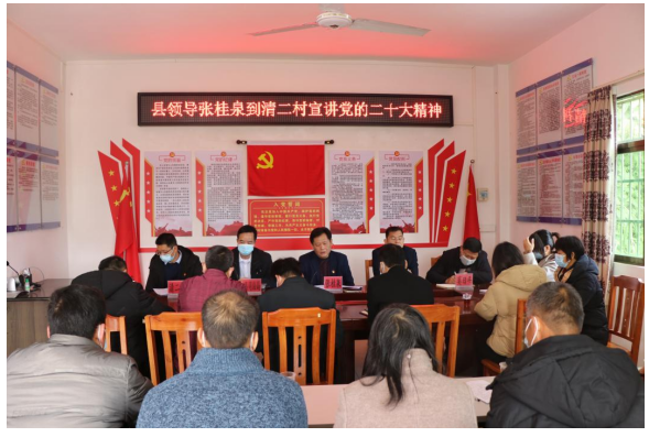 在千官鎮(zhèn)清二村委,張桂泉圍繞深刻領(lǐng)會黨的二十大精神的豐富內(nèi)涵、深刻領(lǐng)會過去五年的工作和新時代十年的偉大變革、深刻領(lǐng)會開辟馬克思主義中國化時代化新境界、深刻領(lǐng)會以中國式現(xiàn)代化全面推進中華民族偉大復興的使命任務等方面,深入淺出地闡述黨的二十大精神的核心要義。并結(jié)合農(nóng)村黨員干部在實際工作中如何貫徹落實做了具體講解,同時強調(diào)要堅持黨的全面領(lǐng)導,聽黨話、感黨恩、跟黨走。要加強黨組織建設,提升戰(zhàn)斗力、凝聚力、向心力。要多開展走訪調(diào)研,多為群眾辦實事、解難事、做好事。要統(tǒng)籌抓好歲末年初工作,做到強謀劃、保穩(wěn)定、促發(fā)展,加快推進美麗鎮(zhèn)村建設,大力發(fā)展村集體經(jīng)濟,推動鎮(zhèn)村各項事業(yè)持續(xù)高質(zhì)量發(fā)展。