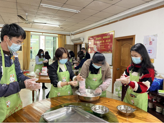 在志愿者的帶領(lǐng)下,局干部職工踴躍前來感受節(jié)日氣氛,大家一起分工合作,將糯米粉加水?dāng)嚢枞喑擅鎴F(tuán),將花生、芝麻、白糖等餡料包入糯米團(tuán)中,搓成大小形狀各異的湯圓,現(xiàn)場各種“個(gè)性”湯圓惹得大家歡樂不斷。