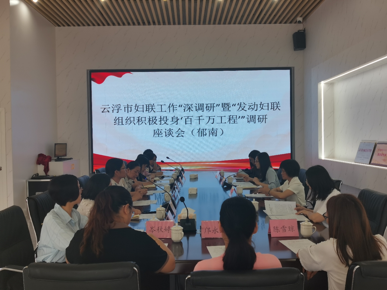 實地調研結束后,調研組一行召開座談會,聽取郁南縣婦聯工作匯報,并圍繞“發動婦聯組織積極投身‘百千萬工程’”、“破難行動”、“科技創新巾幗行動”、婚姻家庭糾紛預防化解聯動機制、兒童友好城市建設和社區家長學校建設等內容與參會人員深入交流,認真聽取意見建議,共同研究對策措施。