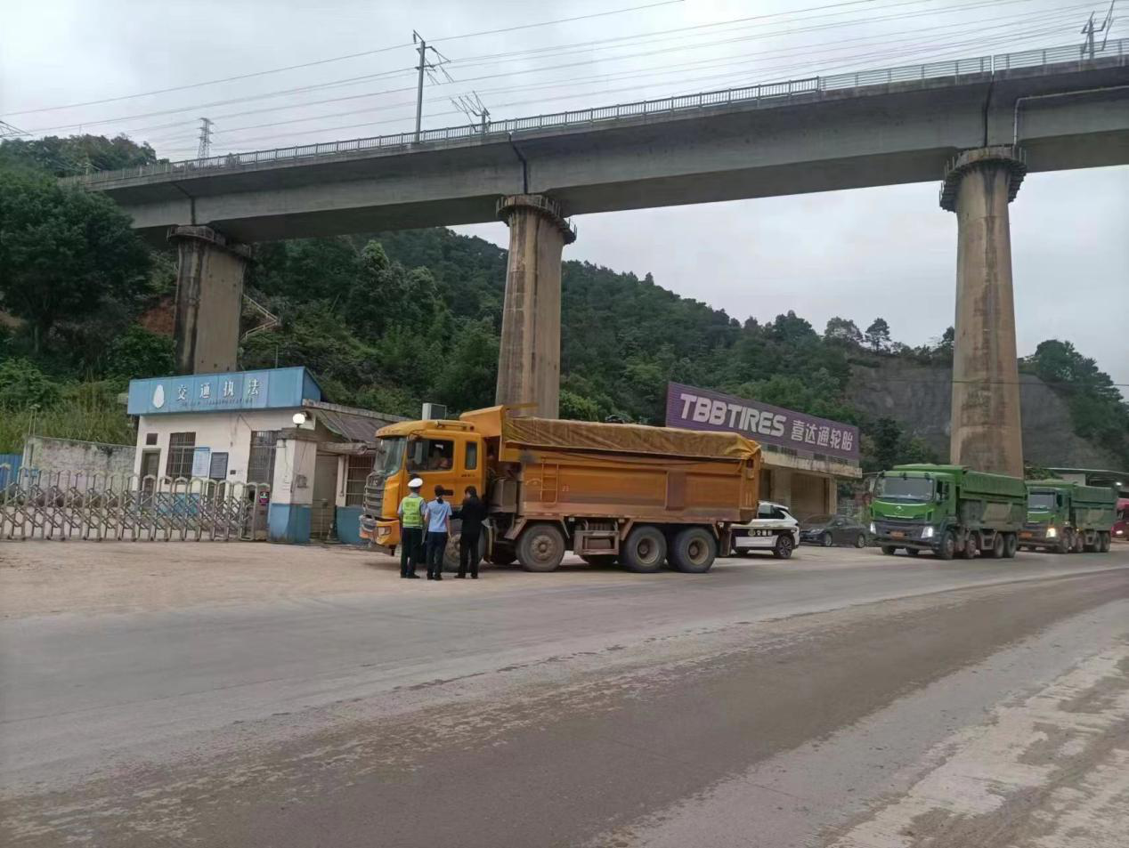 執法人員引導涉嫌違規車輛到南江口鎮治超卸貨場進行稱重檢測