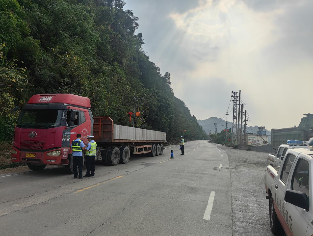 執法人員在S368線南江口鎮路段對貨車進行檢查