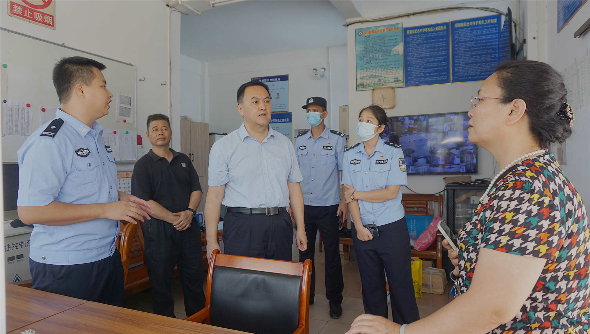 2023年5月26日上午,郁南縣副縣長、縣公安局黨委書記、局長王朝輝帶領縣公安局有關負責同志蒞臨蔡朝焜紀念中學高考考點進行2023年高考考點安全工作檢查。檢查中,王朝輝同志一行對校園最小應急單元、視頻監控、一鍵報警裝置、校園管制刀具、外來人員管理、校園周邊環境等工作進行了詳細檢查,為創建2023年平安高考、暖心高考、健康高考提供了堅實的保障。
