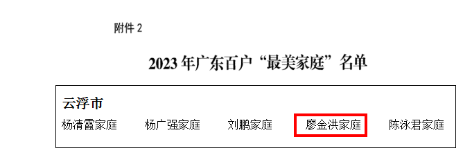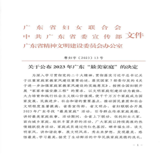 根據省婦聯、省委宣傳部和省文明辦《關于公布2023年廣東“最美家庭”的決定》,我市有5戶家庭獲評2023年廣東百戶“最美家庭”,其中,我縣廖金洪家庭獲選。