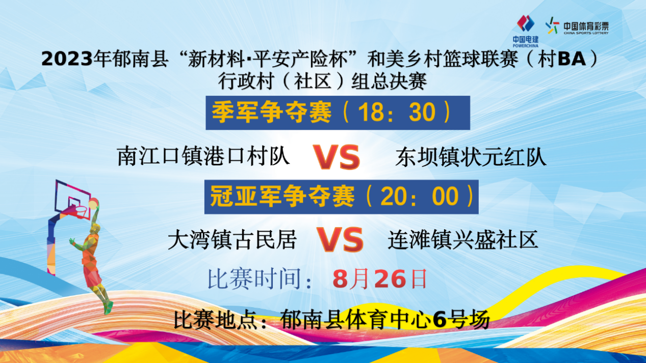 8月26日18:30,2023年郁南縣“新材料·平安產(chǎn)險杯”和美鄉(xiāng)村籃球聯(lián)賽(村BA)行政村(社區(qū))組決賽將在郁南縣體育中心6號籃球場精彩上演。冠軍最終花落誰家?讓我們拭目以待吧!