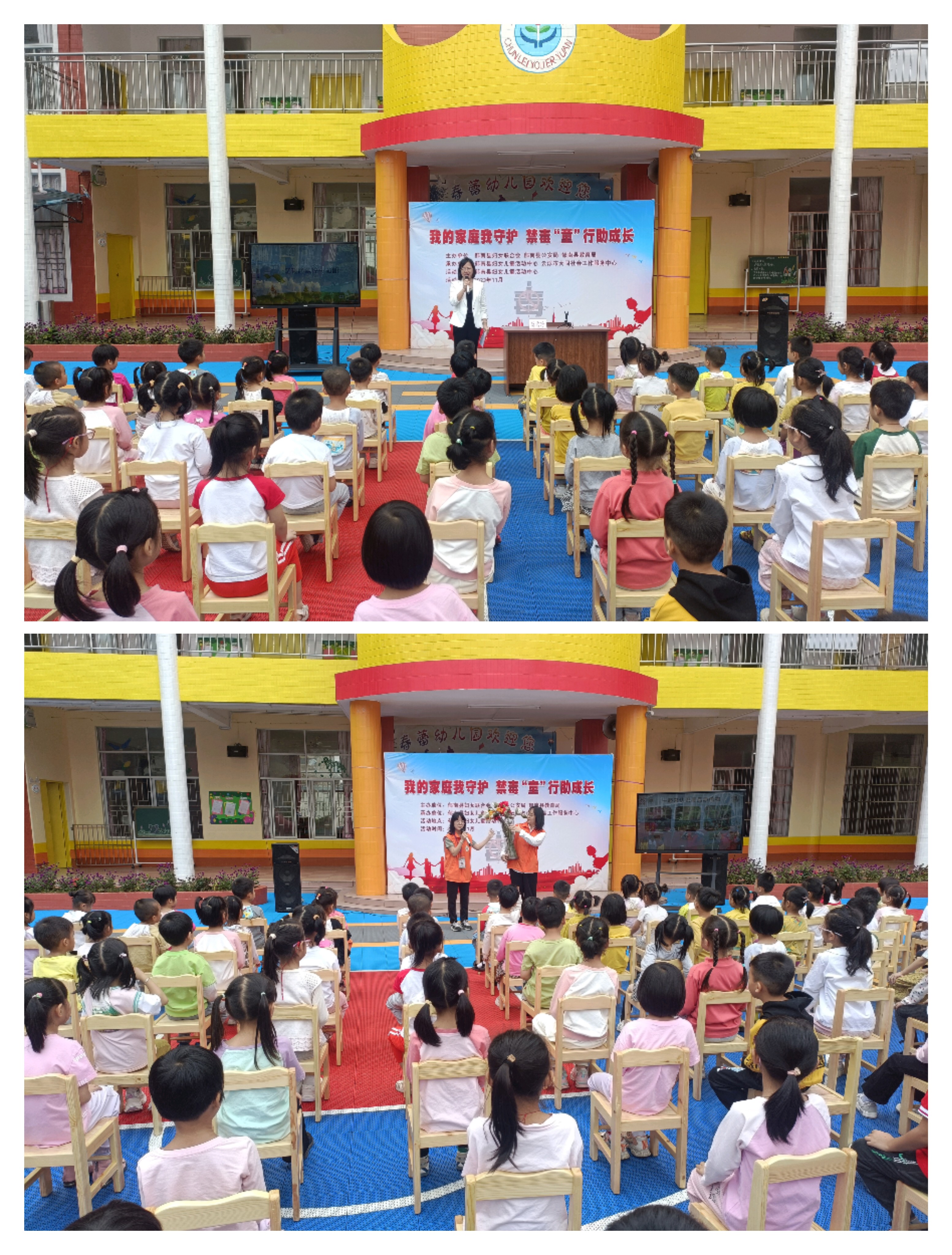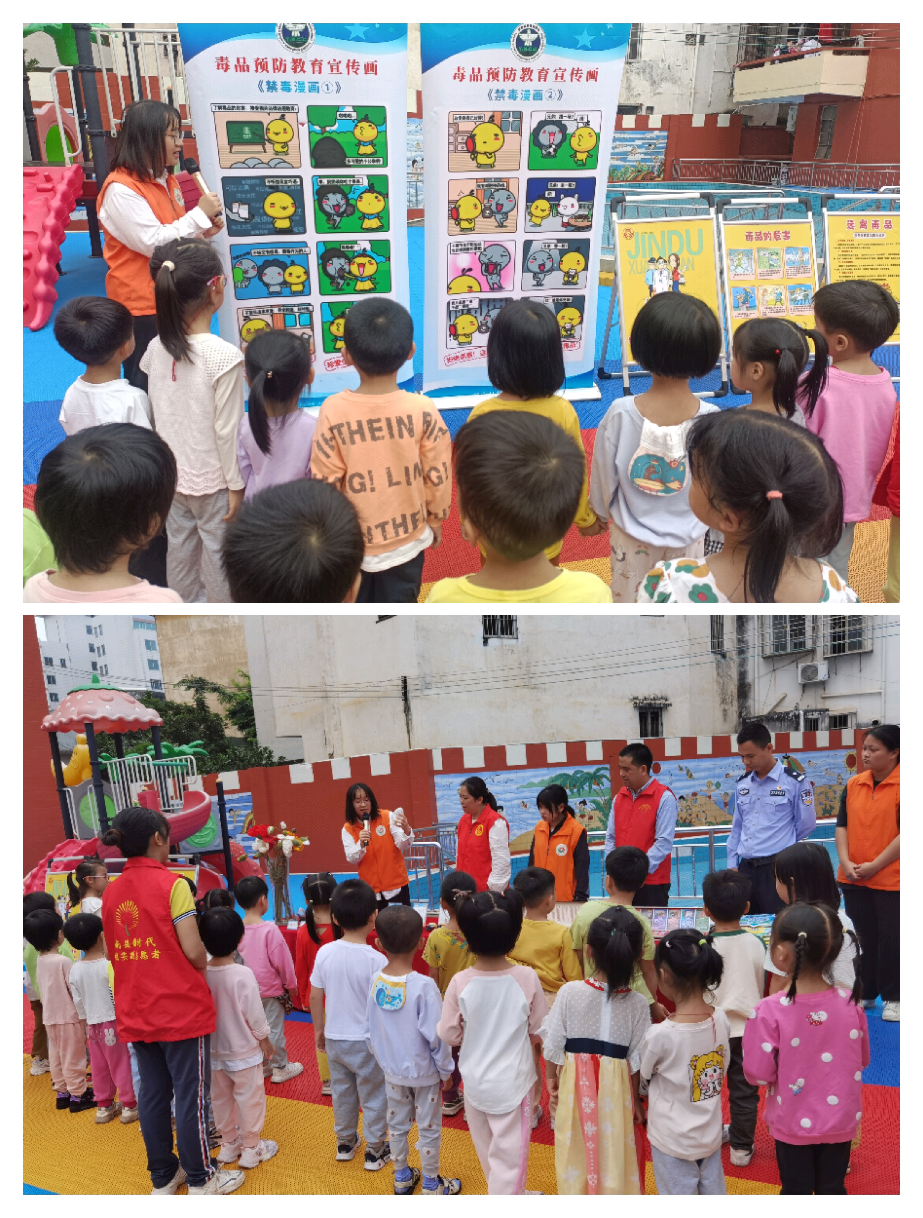 針對幼兒園兒童年紀小、理解能力有限的特點,巾幗禁毒志愿者采用簡潔明了的PPT形式,通過生動有趣的圖片、故事,講解了毒品的形狀特點、吸毒的危害以及怎樣拒絕毒品,教育小朋友們要珍愛生命,遠離毒品,不要隨意接受陌生人的飲料和食品。禁毒小課堂結束后巾幗志愿者組織小朋友們參觀了禁毒宣傳海報和仿真毒品模型,參與“禁毒套圈圈”和“甩毒蛋”等互動游戲。通過宣傳教育和游戲互動,讓參與的孩子們以寓教于樂、寓學于趣的形式認識到毒品的危害,增強對毒品的防范意識和自我保護能力。