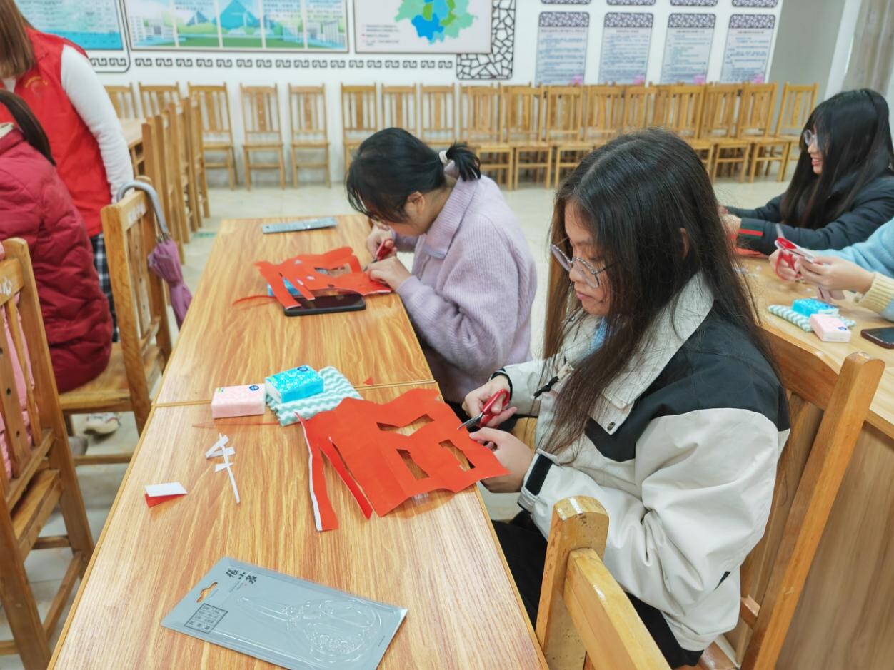 活動中,剪紙老師首先向大家介紹了中國的剪紙文化,包括剪紙的由來、特點、種類、剪法等,活動現場氣氛活躍。參與者們躍躍欲試,紛紛拿起紅紙和剪刀,在老師的指導下,認真創作自己的剪紙作品。大家以紙張為畫布,剪刀為畫筆,通過靈巧的手指和獨特構思,將一張張紅紙變成一個個充滿文化年味的福字“畫作”,表達著對新年的美好祝愿。一個個福字,一張張開心的笑容,組成了最美的照片,不僅展現出了傳統文化的獨特魅力,更傳遞出了辭舊迎新的濃濃喜悅。