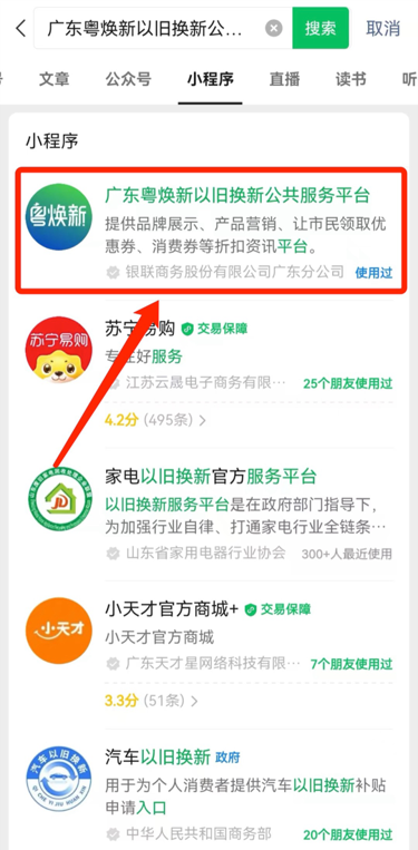 步驟1:打開微信APP搜索“廣東粵煥新以舊換新公共服務(wù)平臺(tái)”