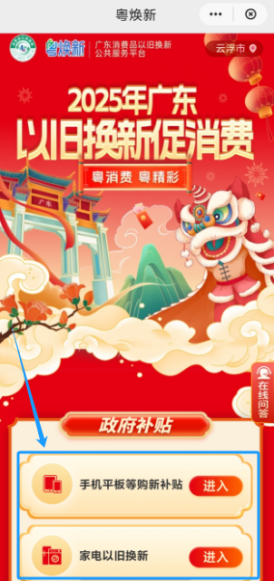 步驟3:定位到所在地后,選擇“手機(jī)平板等購新補(bǔ)貼”并點(diǎn)擊“進(jìn)入”