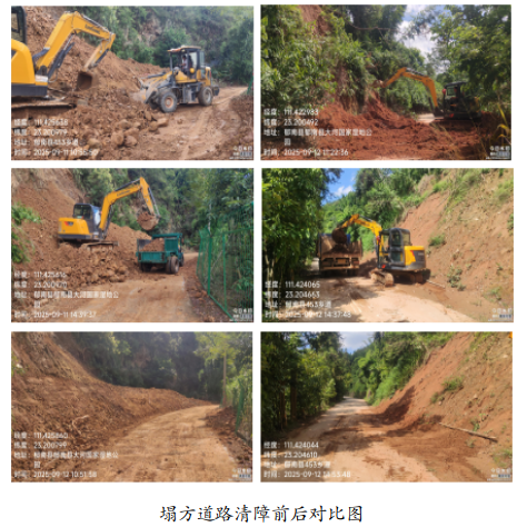 本次塌方共三處,總體積約250立方米。險情發生后,郁南縣水務局迅速響應,立即啟動應急預案,組織搶險力量趕赴現場,全面開展應急清障與道路搶通工作,面對緊急情況,聯合制定清障方案,緊急調集挖掘機、推土機、農用運輸車及手扶拖拉機等設備4臺,連續晝夜施工,全力以赴推進搶通任務。