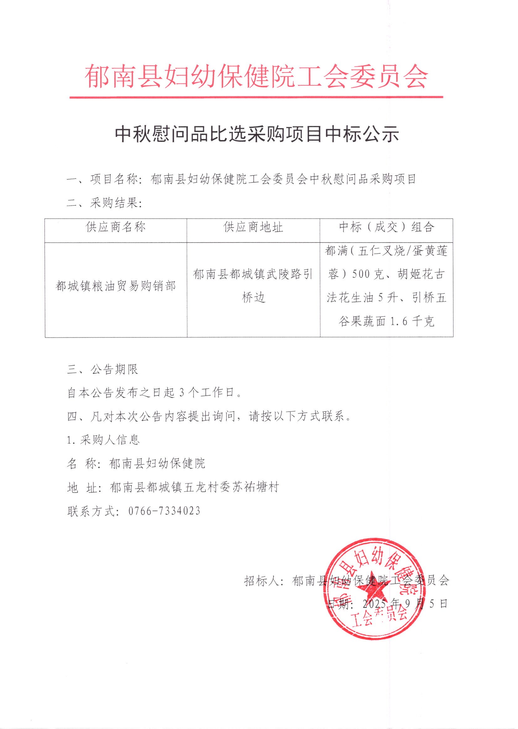 郁南縣婦幼保健院工會委員會中秋慰問品采購項目中標公示